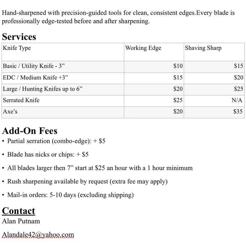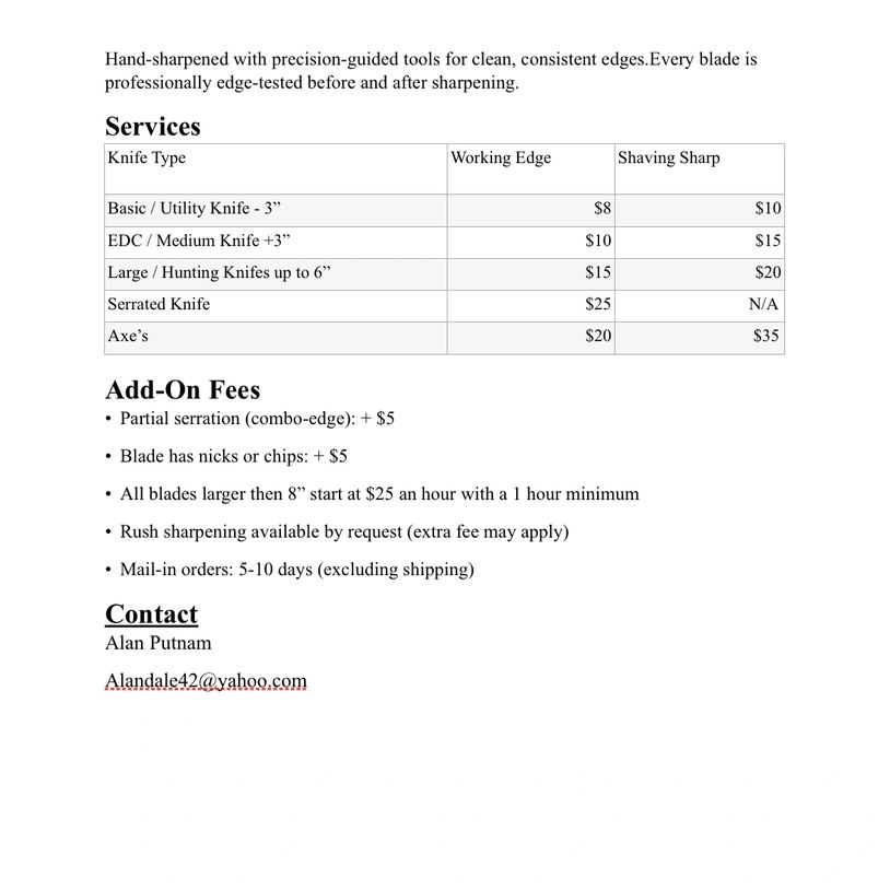 Sharpening may permanently alter the blade’s appearance, bevel, or dimensions. No warranty is given regarding edge longevity, performance depends on usage, storage, and maintenance.The customer assumes all responsibility for safe handling of sharpened items and for informing third parties of the potential danger.We disclaim liability for any injuries, damage, or misuse after return of the item. All work is provided “as is” with no implied warranties.